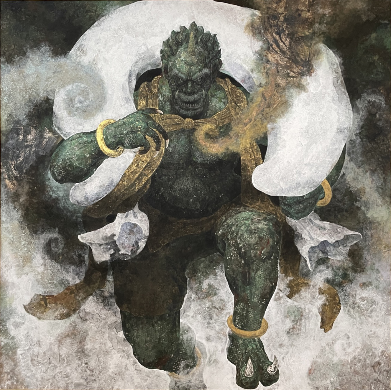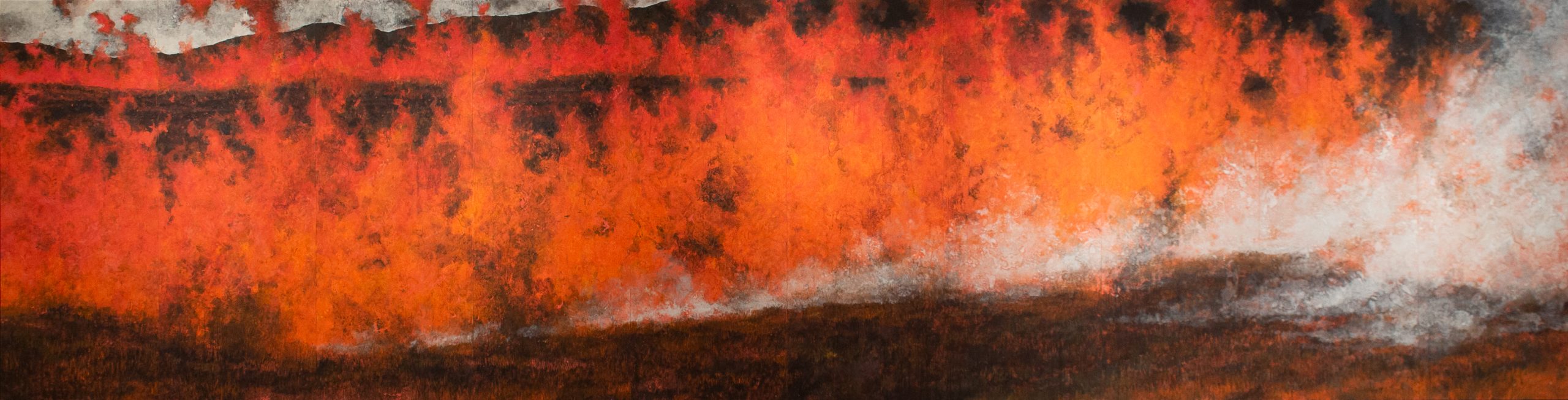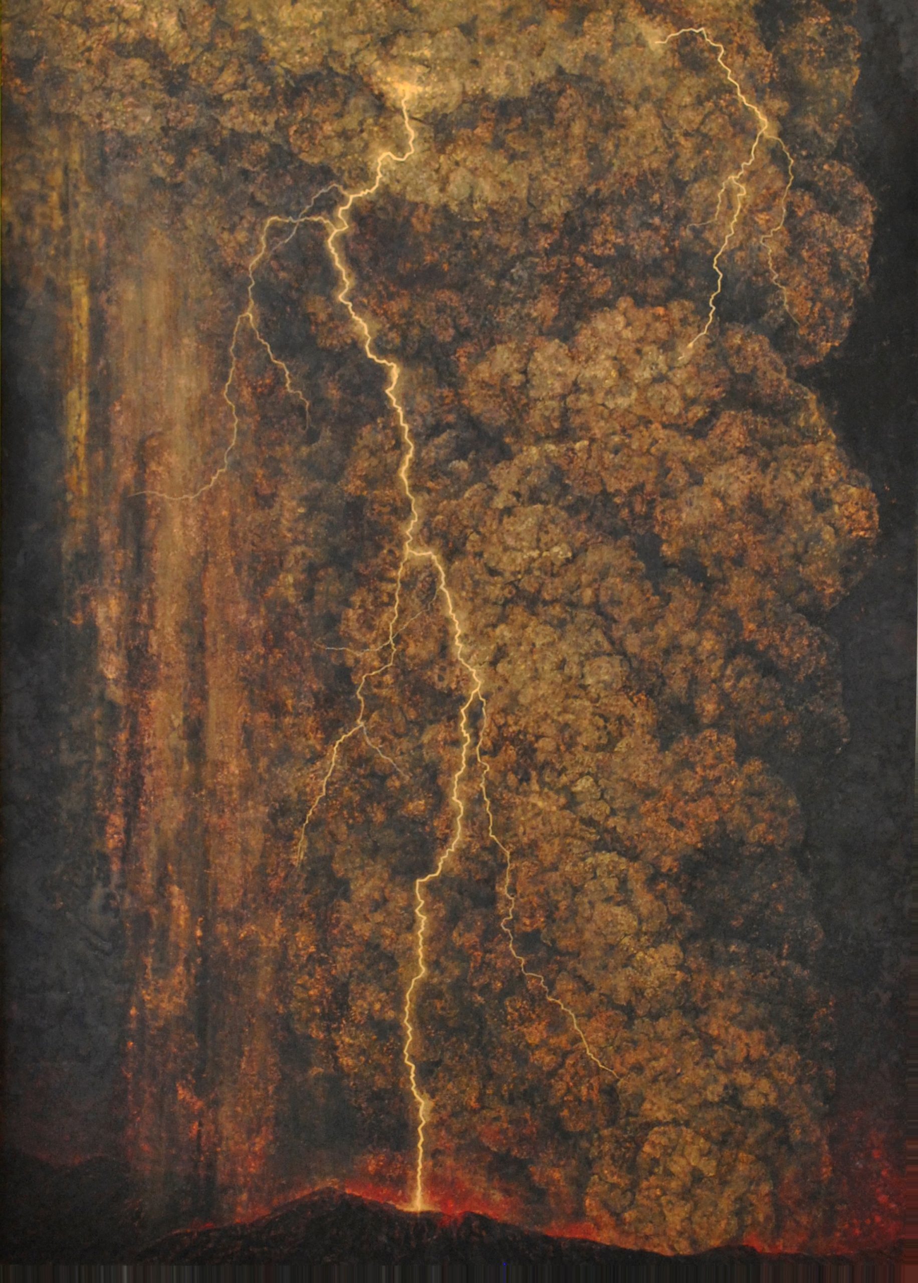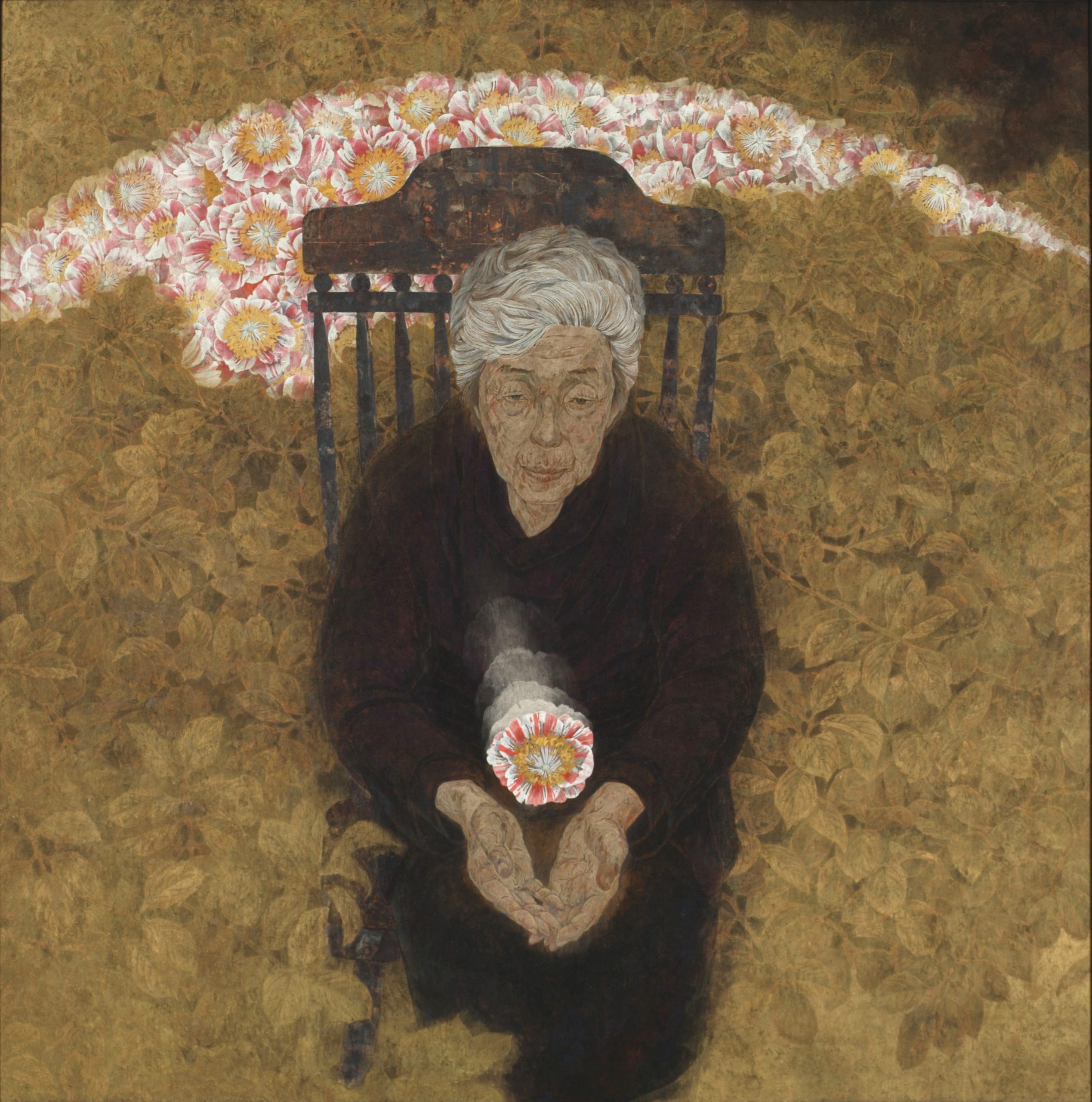 Kenji Nakamura’s paintings offer a paradox: they are made of some of the most enduring materials in Japanese art, mineral pigments, gold leaf, yet what they capture is the fleeting, the vanished, the almost-forgotten. Trained in classical Nihonga yet shaped by his life in Kumamoto’s shifting natural landscape, Nakamura paints not to preserve but to trace time as it passes through form. His flowers do not bloom in fullness but tilt in suspension; his landscapes do not declare themselves, they withhold. The result is a body of work that explores how material permanence can be used to hold impermanence. His use of gold is particularly striking—not luminous or triumphant, but subdued, almost muted, as if tarnished by memory. In this tension between lasting surface and ephemeral subject, Nakamura positions painting as an act of quiet resistance to erasure. This idea reaches full expression in his responses to the 2016 Mount Aso eruption. Rather than depicting disaster, he renders the space left behind: scorched petals, disrupted soil, the fragile return of silence. These works hold no climax, no narrative closure. Instead, they dwell in the aftermath. Here, materiality becomes both burden and offering. The pigments remember what the landscape cannot say. As viewers, we are not asked to interpret but to remain—to sit with the slow aftermath of events, and to consider the weight that fragile things can carry. In this way, Nakamura’s paintings ask a subtle but profound question: how do we hold onto what time insists on letting go?
