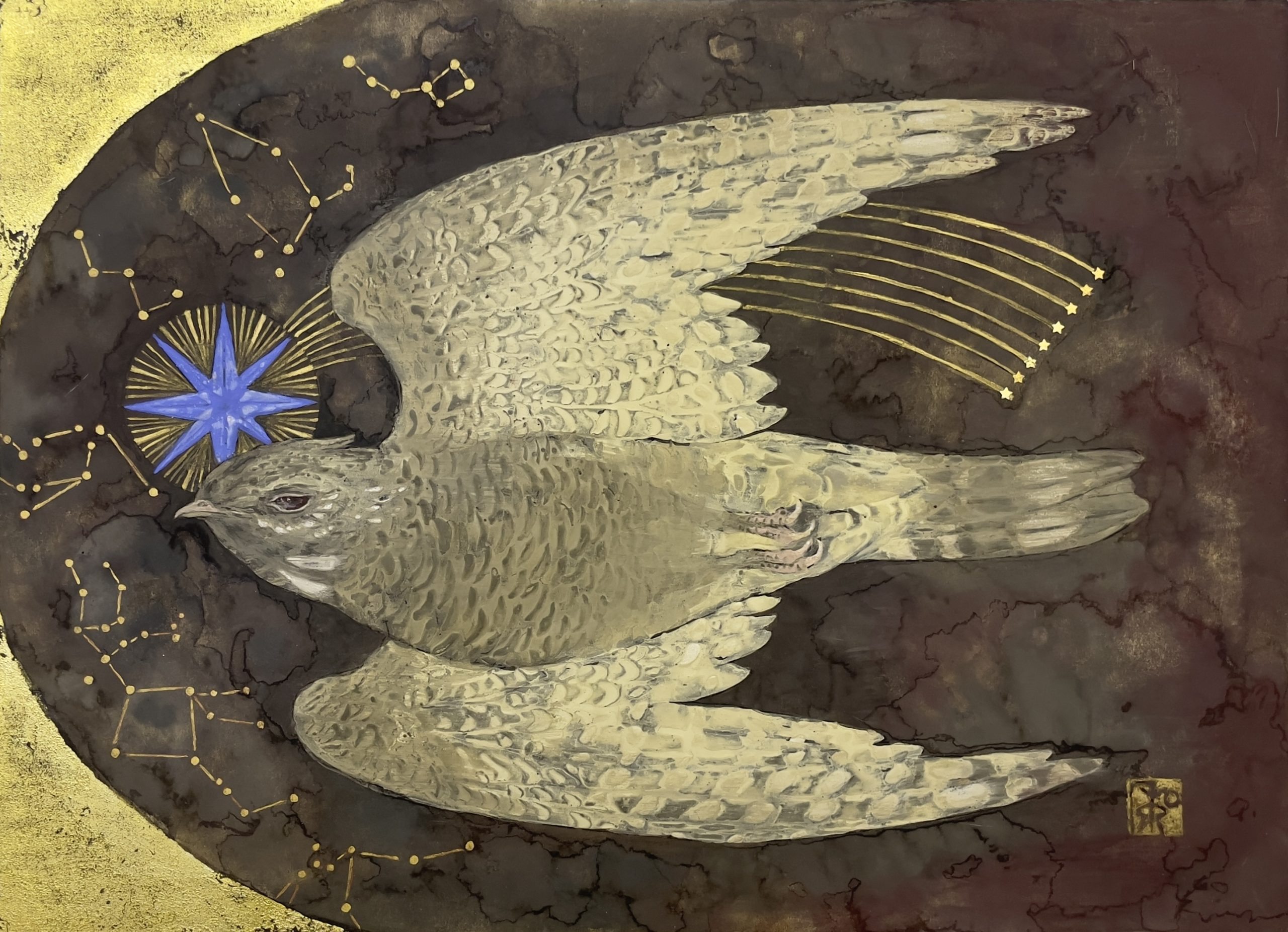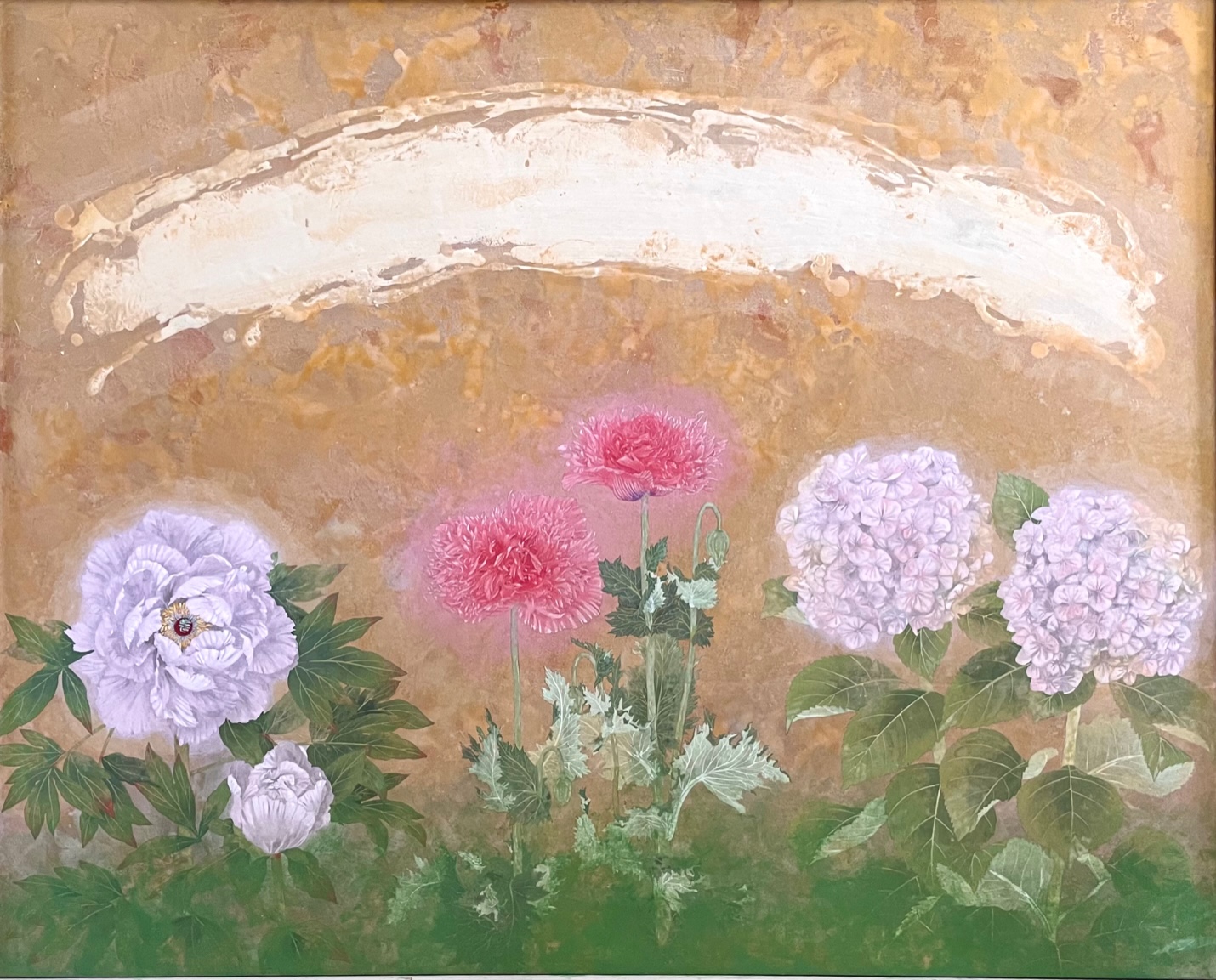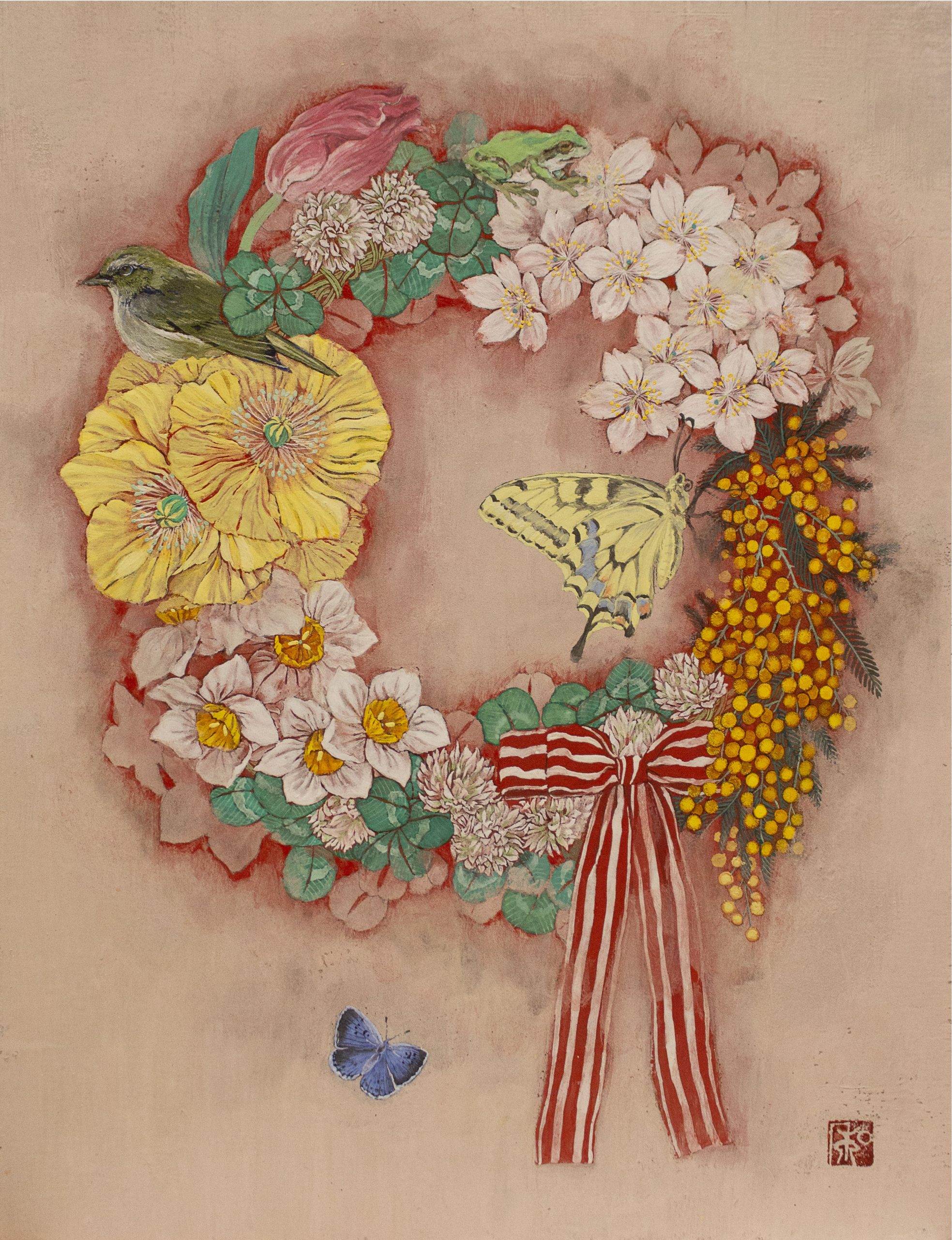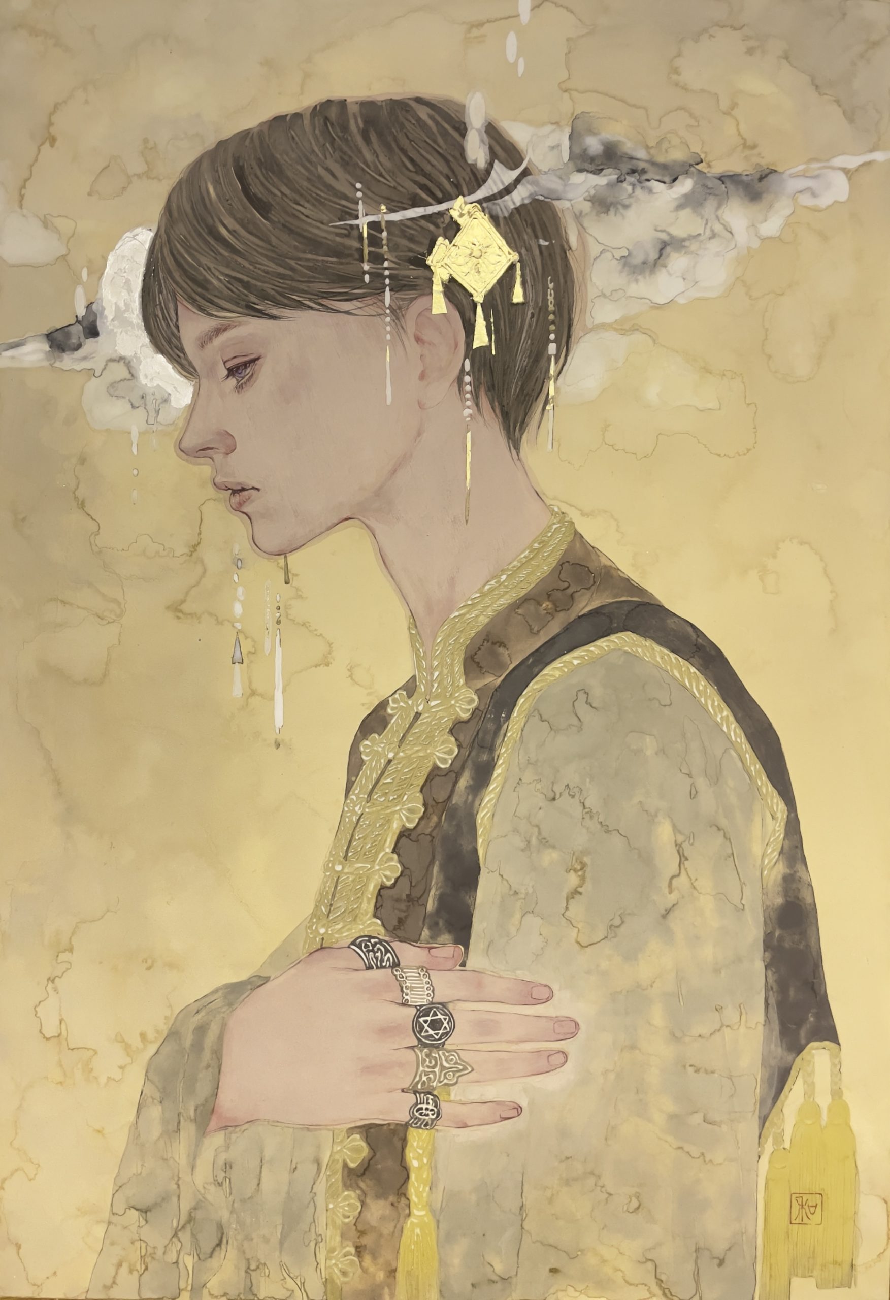 Wakako Sato is a contemporary Nihonga painter and educator based in Kumamoto, where she teaches at Sojo University. Her practice exemplifies how traditional Japanese painting techniques—particularly the use of mineral pigments, washi paper, and gold leaf—can be reimagined to explore contemporary themes of myth, psychology, and transformation. Sato’s paintings frequently feature hybrid figures, merging animal forms, symbolic flora, and dreamlike human presences into textured, otherworldly tableaux. Rather than aligning with the conceptual or ironic tendencies often seen in postmodern Japanese art, she engages a more symbolic and metaphysical register. In her work, nature is not merely depicted but personified, serving as a site of spiritual and psychological inquiry. Through this, Sato transforms Nihonga from a historical technique into a living medium—capable of articulating ambiguity, interiority, and the liminal spaces between self and other, myth and memory.