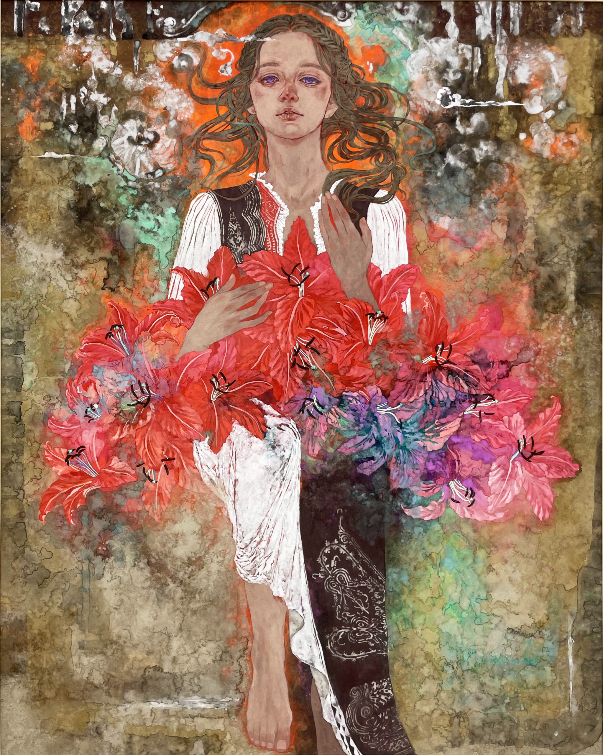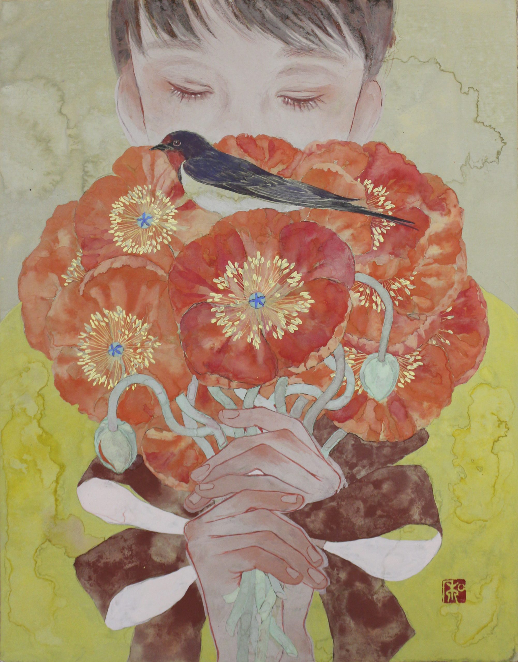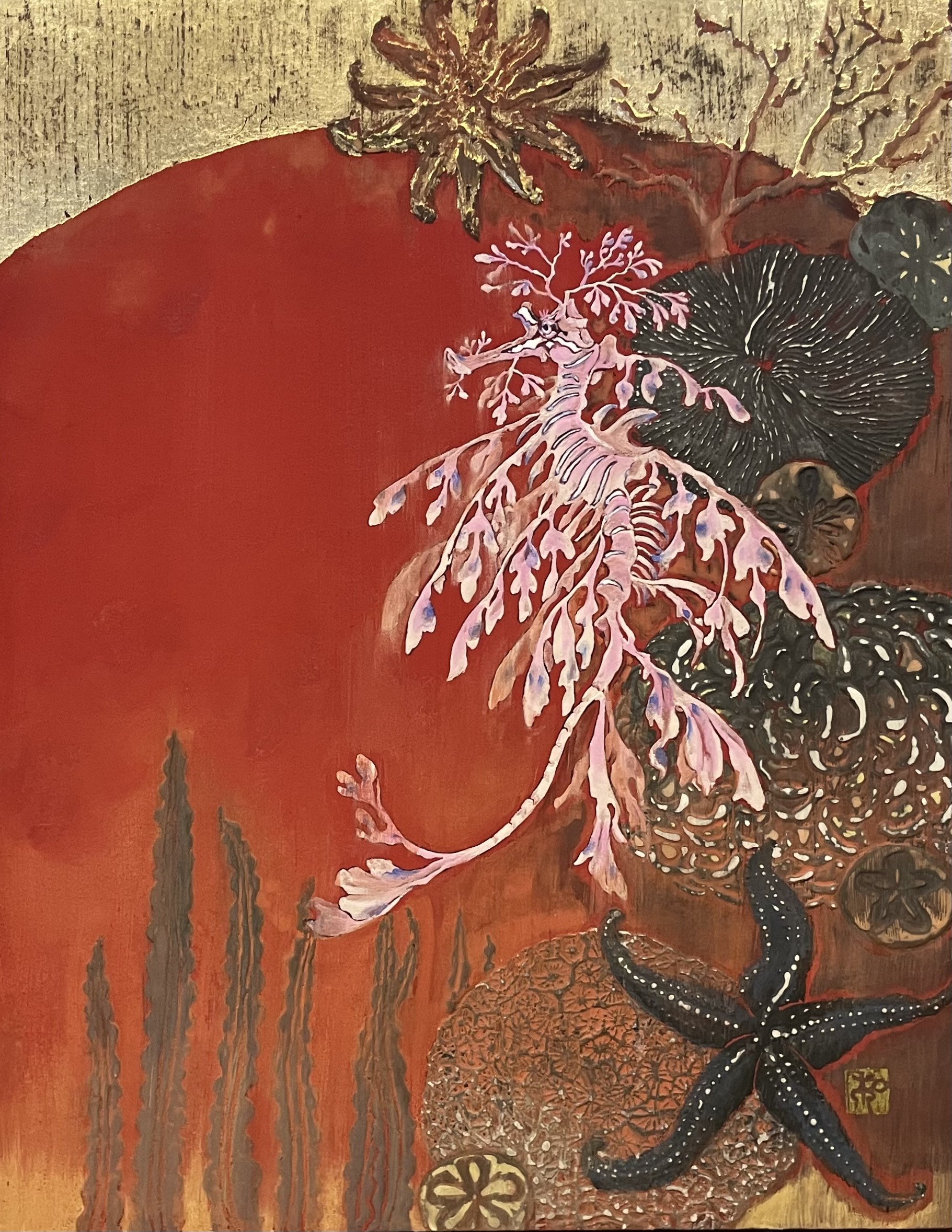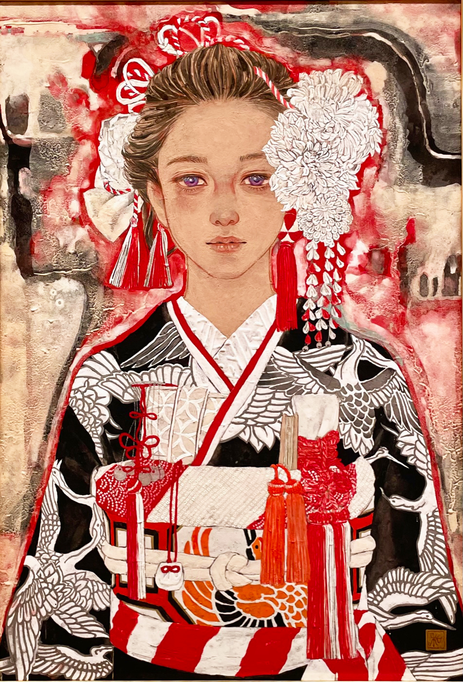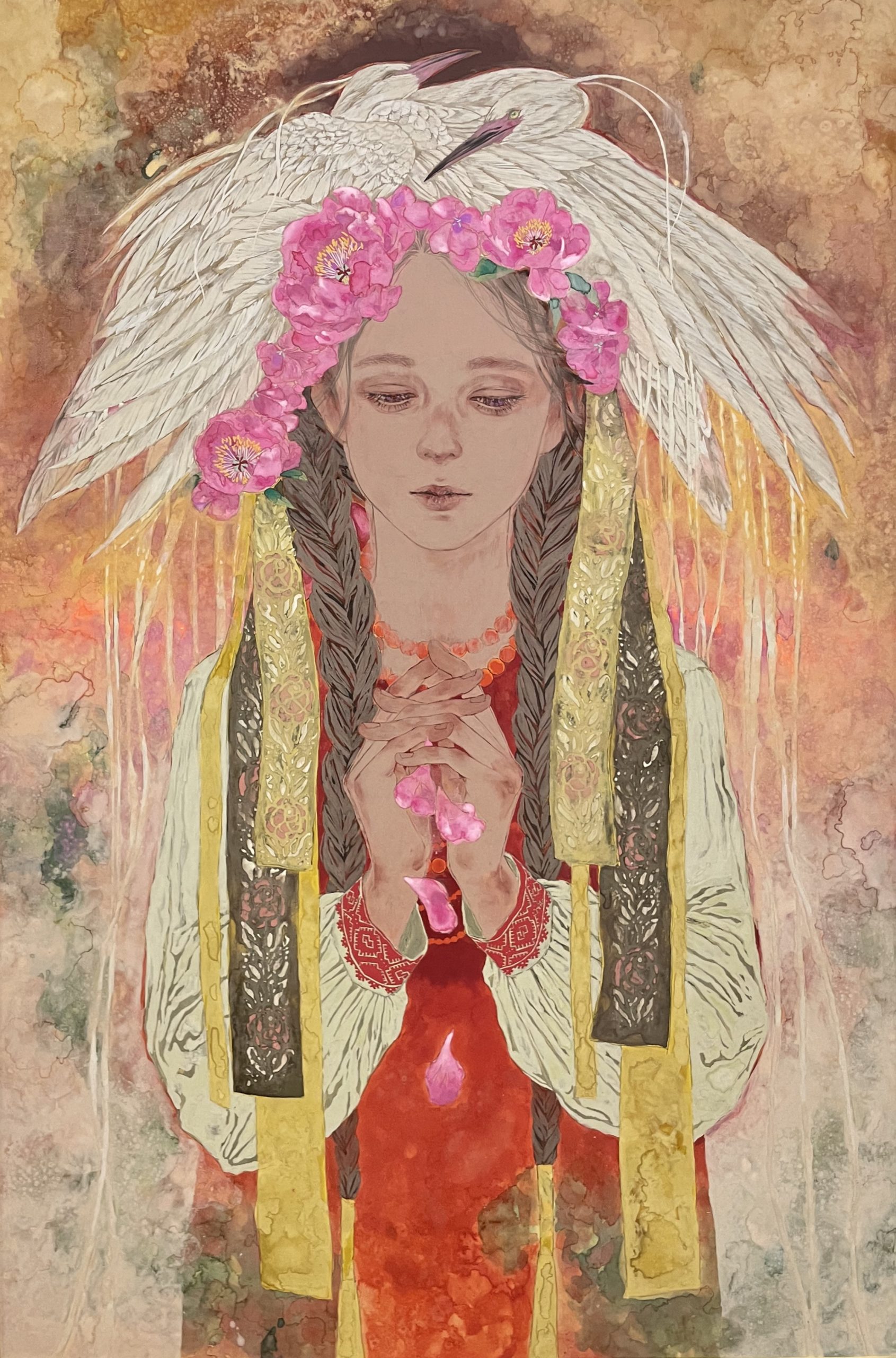 Wakako Sato is a contemporary Nihonga painter and educator based in Kumamoto, where she teaches at Sojo University. Her practice exemplifies how traditional Japanese painting techniques—particularly the use of mineral pigments, washi paper, and gold leaf—can be reimagined to explore contemporary themes of myth, psychology, and transformation. Sato’s paintings frequently feature hybrid figures, merging animal forms, symbolic flora, and dreamlike human presences into textured, otherworldly tableaux. Rather than aligning with the conceptual or ironic tendencies often seen in postmodern Japanese art, she engages a more symbolic and metaphysical register. In her work, nature is not merely depicted but personified, serving as a site of spiritual and psychological inquiry. Through this, Sato transforms Nihonga from a historical technique into a living medium—capable of articulating ambiguity, interiority, and the liminal spaces between self and other, myth and memory.