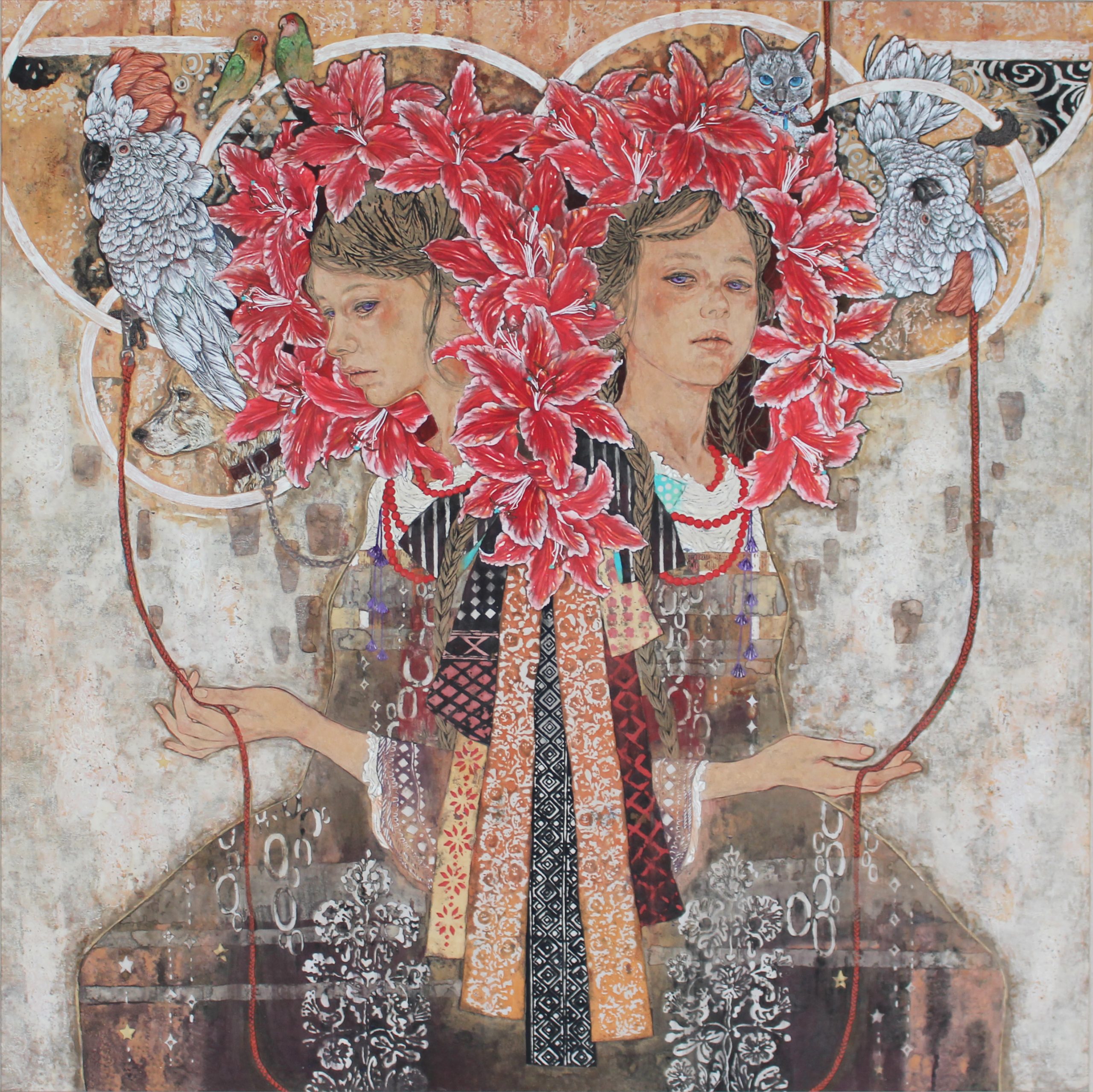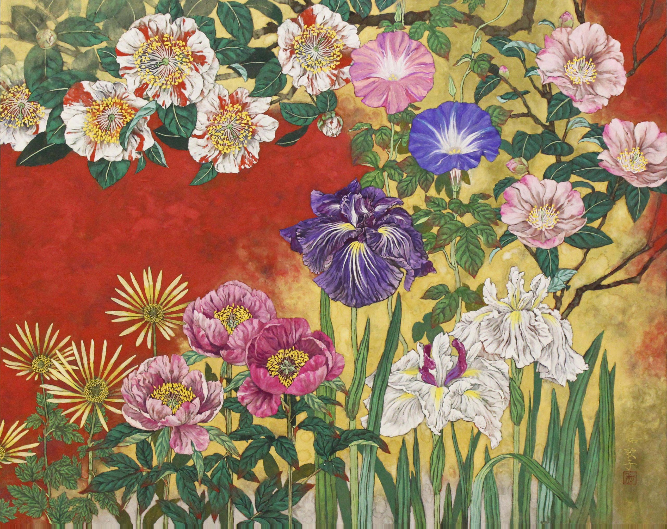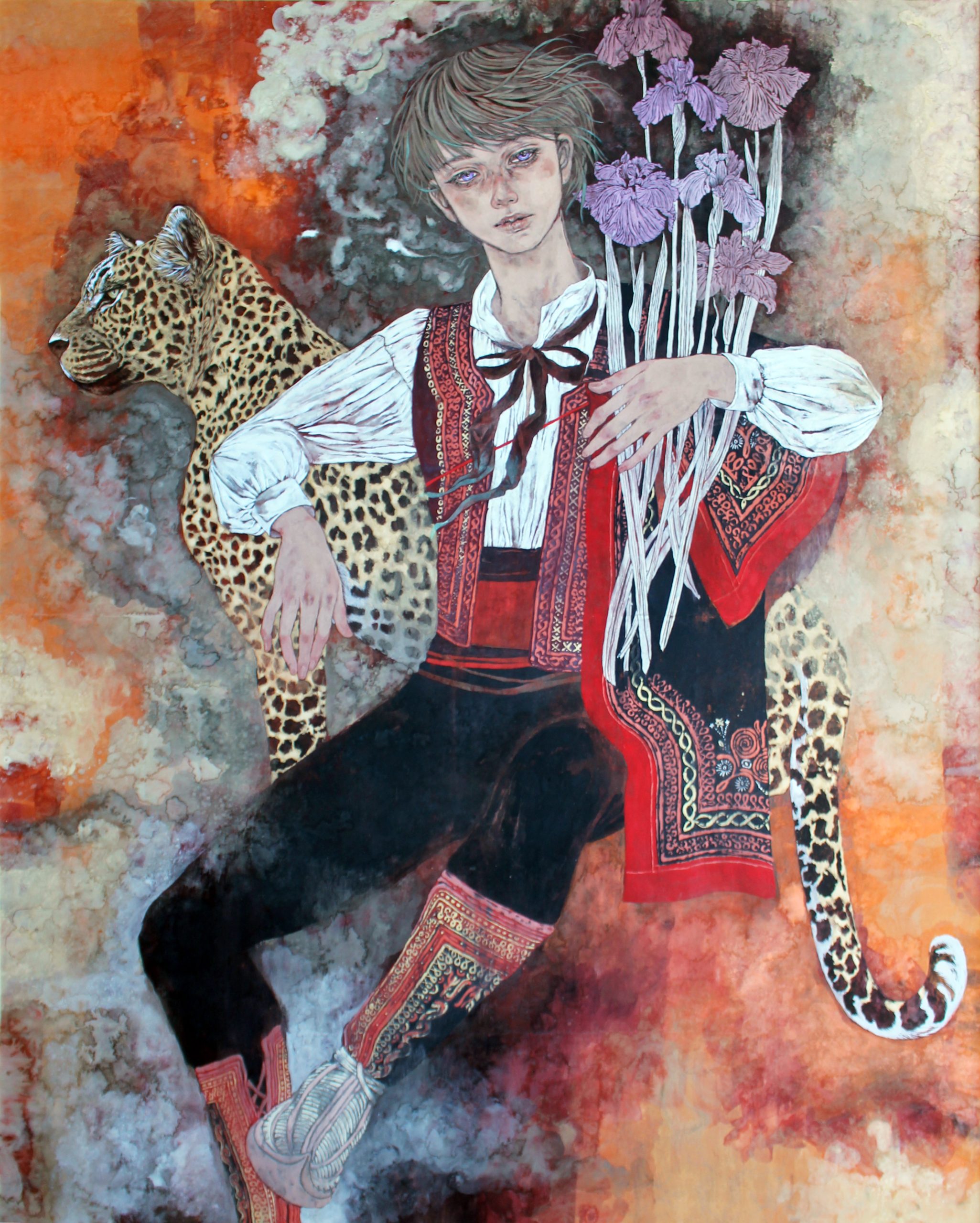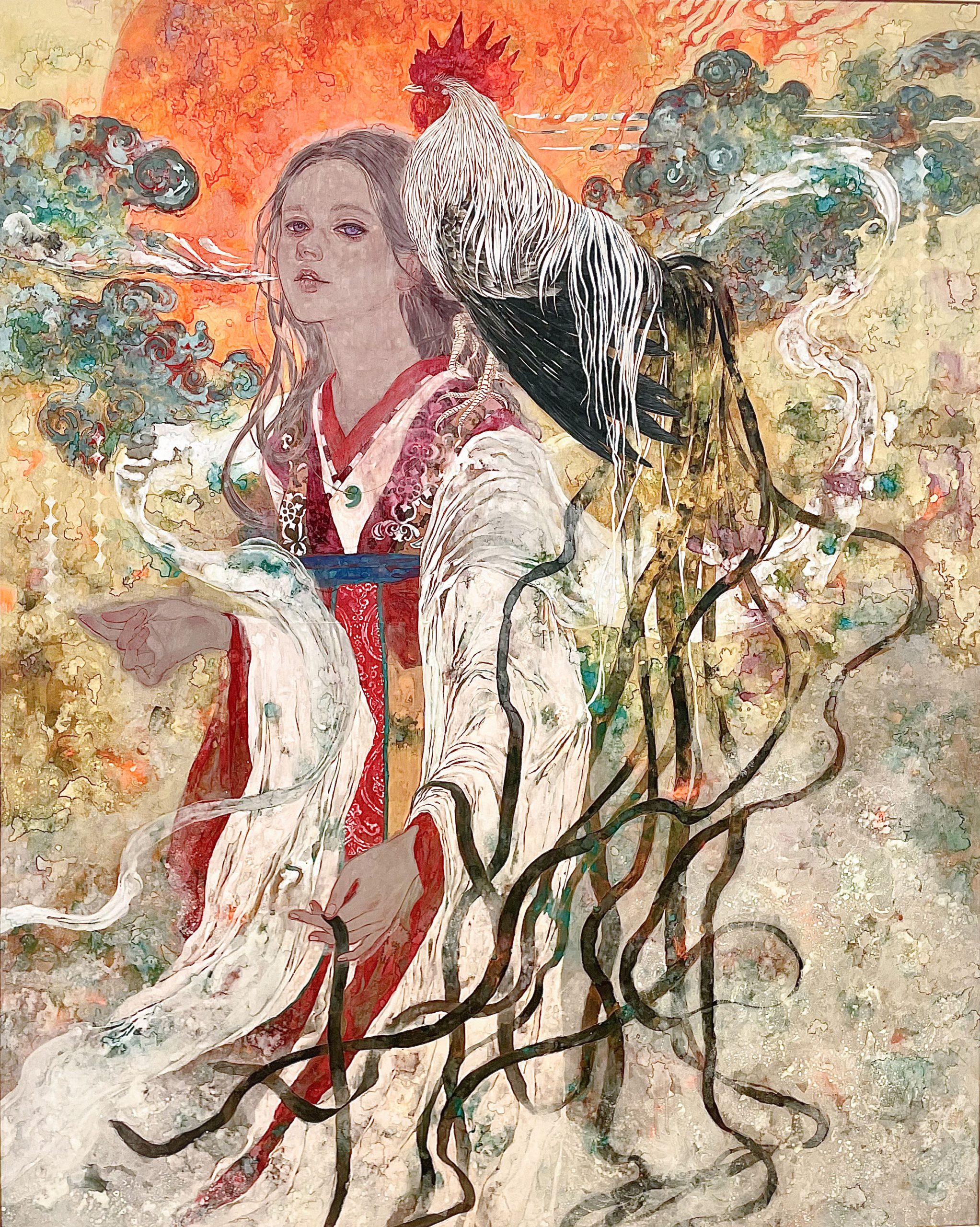 Wakako Sato is a contemporary Nihonga painter and educator based in Kumamoto, where she teaches at Sojo University. Her practice exemplifies how traditional Japanese painting techniques—particularly the use of mineral pigments, washi paper, and gold leaf—can be reimagined to explore contemporary themes of myth, psychology, and transformation. Sato’s paintings frequently feature hybrid figures, merging animal forms, symbolic flora, and dreamlike human presences into textured, otherworldly tableaux. Rather than aligning with the conceptual or ironic tendencies often seen in postmodern Japanese art, she engages a more symbolic and metaphysical register. In her work, nature is not merely depicted but personified, serving as a site of spiritual and psychological inquiry. Through this, Sato transforms Nihonga from a historical technique into a living medium—capable of articulating ambiguity, interiority, and the liminal spaces between self and other, myth and memory.
